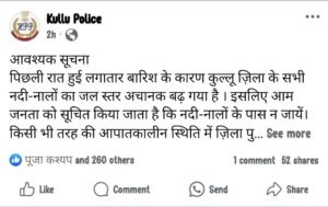 कुल्लू अपडेट,आनी विधानसभा क्षेत्र के विधायक लोकेन्द्र कुमार ने अपनी आधिकारिक फेसबुक पेज के माध्यम से जानकारी दी कि निरमंड मे बीती रात समेज खड्ड