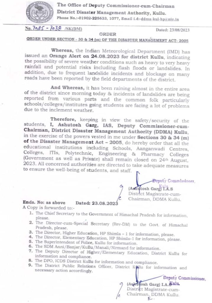 कुल्लू अपडेट,जिला कुल्लू के उपायुक्त आशुतोष गर्ग ने बताया कि मौसम विभाग द्वारा जिला कुल्लू में ऑरेंज अलर्ट जारी किया गया है जो आज और कल दोनो दिनों के लिए जारी किया गया है।कुल्लू में मैक्सिमम एरिया में आज सुबह से रेनफॉल हो रहा है। पिछले कल रात मेजर रेनफॉल एक्टिविटी डिस्ट्रिक्ट कुल्लू में नहीं थी लेकिन इस चीज को ध्यान में रखते हुए की आज पूरे जिले में रेनफॉल हो रहा है और कल भी ऑरेंज अलर्ट मौसम विभाग द्वारा जारी किया गया है तो कल हमारे जिले में जितने भी एजुकेशन इंस्टीट्यूशंस है। आंगनबाड़ी सेंटर है ,चाहे वो प्राइवेट या गवर्नमेंट जो भी एजुकेशन इंस्टीट्यूशंस है इन सबको बंद रखने का फैसला लिया है।