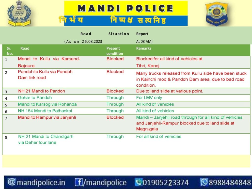 कुल्लू अपडेट कुल्लू पुलिस मंडी पुलिस की से जानकारी दी गई कि कुल्लू मंडी वाया पंडोह सड़क कई स्थानों पर लैंडस्लाइड के कारण बंद है और कुल्लू मंडी वाया कमांद सड़क लैंडस्लाइड के कारण बंद है.पड़ोह से गोहर सिर्फ छोटे वाहनों की आवाजाही के लिए खुला है.कुल्लू पुलिस के द्वारा लोगो से अपील कि गयी है कि लोग बारिश के दौरान बेवजह यात्रा करने से बचें और खुद को सुरक्षित रखें।वही एसपी कुल्लू साक्षी वर्मा ने बताया कि लोगो की सुरक्षा पुलिस की प्राथमिकता है और पुलिस हमेशा जिसके लिए हमेशा तत्पर है.