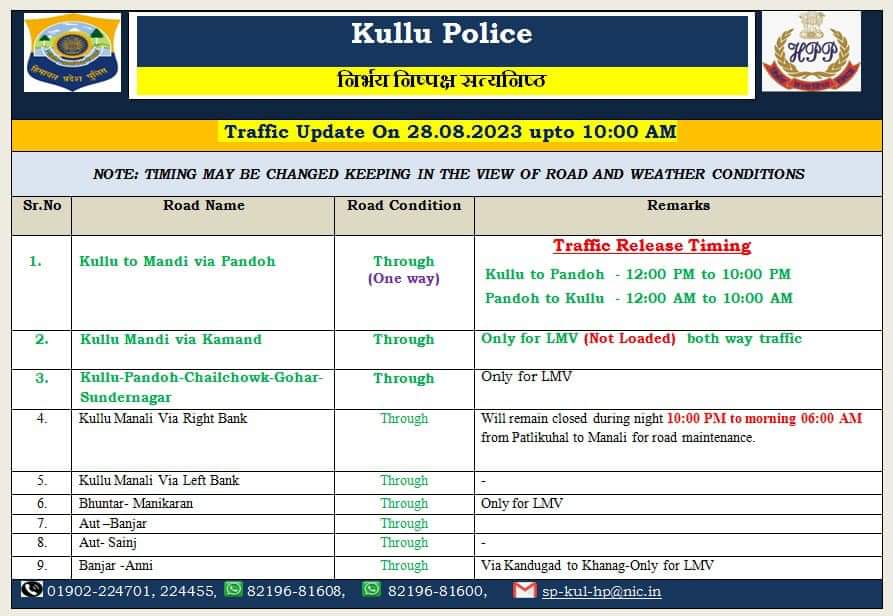 कुल्लू अपडेट,कुल्लू-मण्डी वाया पडोंह यातायात के लिए बहाल हो गया है। लेकिन सड़क की स्थिति और वाहनों की अधिक संख्या के कारण इस सड़क पर वाहनों की आवाजाही एक समय एक तरफा ही की गई है । पंडोह से कुल्लू की तरफ वाहनों को भेजने का समयः- 12:00 AM TO 10:00 AM है | ओट/कुल्लू की तरफ से वाहनों को भेजने का समयः- 12:00 PM TO 10:00 PM है | इस समय पंडोह से कुल्लू की तरफ आने वाले वाहनों को रोक दिया गया है और दोपहर 12 बजे के बाद ओट/कुल्लू से वाहनों को पंडोह की तरफ भेजना शुरु कर दिया जाएगा है ।कुल्लू-मण्डी वाया कमांद सड़क छोटे वाहनों के लिए बहाल हो गई है। लेकिन सड़क की स्थिति बेहतर न होने के कारण इस मार्ग से केबल छोटे और खाली वाहनों को ही दोनों ओर भेजा जा रहा है । कुल्लू से मंडी वाया चैलचौक भी हल्के वाहनों के लिए खुल चुका है | उपायुक्त कुल्लू और कुल्लू पुलिस के द्वारा लोगो से अपील कि गयी है की अभी भी बहुत से लोग दोनों ओर फंसे हुए है इसलिए केवल जरूरी होने पर ही यात्रा करें अन्यथा अपने अपने घरों में सुरक्षित रहें |