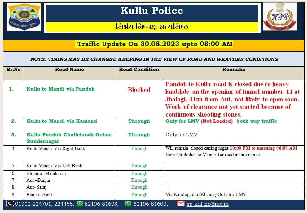 कुल्लू अपडेट , कुल्लू-मण्डी वाया पडोंह सड़क झलोगी के पास टनल नम्बर 11 के पास land slide होने के कारण बंद हो गई है। लगातार पत्थर गिर रहे हैं जिस कारण सड़क बहाली का कार्य अभी शुरू नही हो पाया है। कुल्लू-मण्डी वाया कमांद सड़क छोटे वाहनों के लिए बहाल है । लेकिन सड़क की स्थिति बेहतर न होने के कारण इस मार्ग से केबल छोटे और खाली वाहनों को ही भेजा जा रहा है । कुल्लू से मंडी वाया चैलचौक भी हल्के वाहनों के लिए खुल चुका है | उपायुक्त कुल्लू और कुल्लू पुलिस के द्वारा लोगो से अपील कि गयी है की अभी भी बहुत से लोग दोनों ओर फंसे हुए है इसलिए केवल जरूरी होने पर ही यात्रा करें अन्यथा अपने अपने घरों में सुरक्षित रहें |