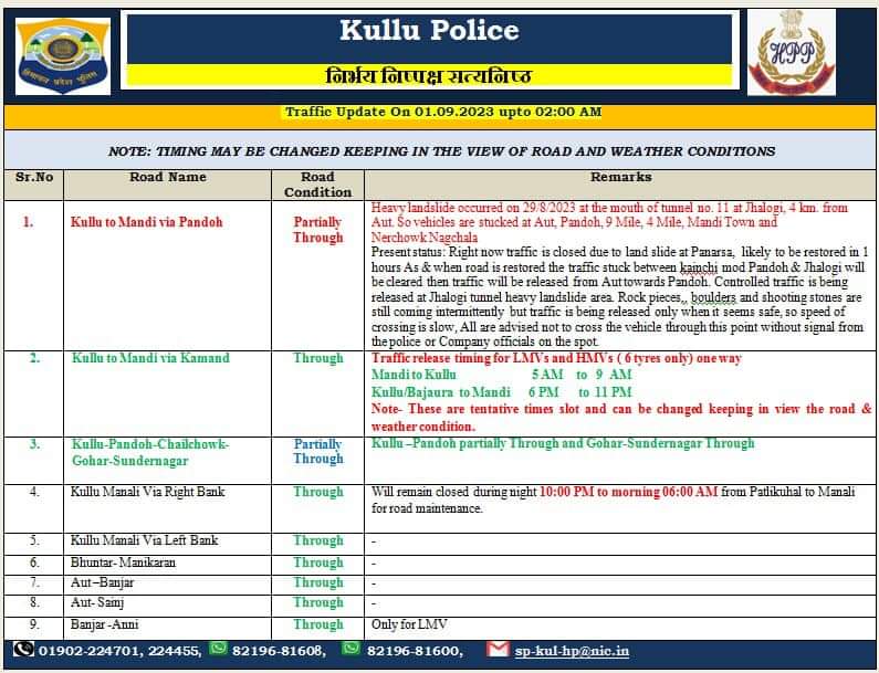 कुल्लू अपडेट,कुल्लू-मण्डी वाया पडोंह झलोगी सड़क के पास को टनल नम्बर 11 के पास 29 अगस्त 2023 को भूस्खलन होने के कारण बंद हो गई थी । लगातार पत्थर गिरने के कारण सड़क बहाली का कार्य अभी तक शुरू नही हो पाया था | जिसके कारण बहुत से वाहन औट ,पंडोह ,9 मील, 4 मील , मंडी शहर , नेरचौक और नागचला में फंसे हुए थे | पुलिस प्रशासन इस रास्ते को बहाल करने के लिए मेहनत करती रही |हाल फ़िलहाल की बात करें तो कुल्लू से पंडोह सड़क मार्ग को बहाल कर दिया गया है | कुल्लू पुलिस की ओर से अपडेट जारी की गयी है जिसमें उन्होने कहा है की भी पनारसा में भूस्खलन होने के कारण वाहनों की आवाजाही रोक दी गयी है | इस सड़क मार्ग को बहाल करने में लगभग 1 घंटे का समय लग सकता है इसलिए जैसे ही सड़क मार्ग बहाल हो जाएगा जो भी गाड़ियां कैंची मोड़ , पंडोह और झलोगी में फंसी हुई है उन्हें निकला जाएगा उसके बाद ही औट से पंडोह की तरफ गाड़ियों को भेजा जाएगा | उन्होने यह भी बताया की नियंत्रित यातायात को ही झलोगी से होते हुए मंडी की तरफ भेजा जा रहा क्यूंकि झलोगी के पास जिस जगह पर भूस्खलन हुआ था वहां पर अभी भी चट्टानों के टुकड़े , पत्थर रुक रुक कर सड़क की ओर आ रहे है इसलिए पूरी तरह से वाहनों की आवाजाही तभी होगी जब उन्हें लगेगा की ये रास्ता सुरक्षित है | कुल्लू पुलिस ने लोगों को सलाह दी है की पुलिस की इजाजत के बिना इस रास्ते का प्रयोग न करें क्यूंकि यह खतरनाक साबित हो सकता है |