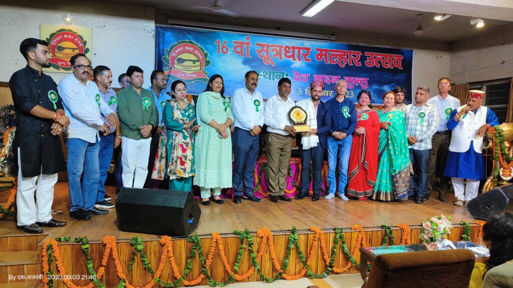कुल्लू अपडेट, देव सदन कुल्लू के सभागार में सूत्रधार कला संगम कुल्लू द्वारा आयोजित 16वां मल्हार उत्सव बड़ी धूमधाम व हर्षोल्लास से सम्पन्न हुआ | कार्यक्रम की शुरुआत दीप प्रज्ज्वलन से हुई | तत्पश्चात सूत्रधार कला संगम के कलाकारों द्वारा गीत-संगीत व नृत्य की एक से बढ़कर एक प्रस्तुतियां दी गई | कार्यक्रम में गौरी, करिश्मा, सिमरन, धनवंती, अर्पिता व ट्विंकल ने राग मियां मल्हार, ईशा ने नैनों में बदरा छाए, अर्पिता व विजय ने सावन का महिना, बालकृष्ण ने रिमझिम गिरे सावन, संजय ने मौसम आयेंगे जायेंगे, करिश्मा ने लग जा गले, अर्पिता ने ओ सजना बरखा, पायल ने मेरे नैना सावन भादो व कहां से आये बदरा, ट्विंकल व अर्पिता ने नीला आसमां तथा ट्विंकल ने पत्ता-पत्ता बूटा-बूटा की बेहतरीन प्रस्तुतियां दी | इसके साथ ही कार्यक्रम में पधारे रविकांता कश्यप ने भी अपनी प्रस्तुतियां दी | इनके साथ तबले पर अमित महंत व बांसुरी पर निशांत गौतम ने संगत की | इसके बाद रेखा ने सेमी क्लासिकल नृत्य की बहुत ही शानदार प्रस्तुति पेश की | इस 16वें सूत्रधार मल्हार उत्सव में जिला परिषद अध्यक्ष पंकज परमार ने मुख्यातिथि के रूप में शिरकत की | संस्था द्वारा मुख्यातिथि को कुल्लवी परम्परा अनुसार शॉल, टोपी व स्मृति चिन्ह भेंट कर सम्मानित किया गया | इसके साथ ही मुख्य कलाकारा शिवी आर कश्यप सहित जिला लोक सम्पर्क अधिकारी नरेंद्र शर्मा, मुख्य चिकित्सक डॉ० नागराज, अध्यक्ष फ्रूट ग्रोअर एसोसिएशन भुंतर करतार सिंह गुलेरिया, प्रसिद्ध संगीतकार एस०डी० कश्यप व लोक कलाकारा रविकांता कश्यप को भी कुल्लवी परम्परा अनुसार सम्मानित किया गया | संस्था अध्यक्ष दिनेश सेन ने अपने स्वागत भाषण में आये हुए सभी मेहमानों व मीडिया का स्वागत किया | कार्यक्रम में पधारे मुख्यातिथि जिला परिषद अध्यक्ष पंकज परमार ने संस्था द्वारा किये जा रहे प्रयासों की भूरी-भूरी प्रशंसा की | 16वें सूत्रधार मल्हार उत्सव के रंगारंग सांस्कृतिक कार्यक्रम में आई मुख्य बॉलीवुड कलाकारा शिवी आर कश्यप ने बहुत ही खूबसूरत सदाबहार गानों की प्रस्तुतियां दी, जिसमें फजां भी है जवां-जवां, दिल में किसी के प्यार का जलता हुआ दिया, एहसान तेरा होगा मुझपर, गुलों में रंग भरे, बहारों मेरा जीवन भी संवारों, चिट्ठिये दर्द फ़िराक, तुझसे नाराज़ नही जिन्दगीं, रहे न रहे हम, रंजिश ही सही, ये दिल टीम बिन, ध्याड़ा काटणा नाला पर सोई, तेरी आँखों के सिवा व छाप तिलक गीतों की खुबसूरत प्रस्तुतियां देकर वाहवाही लुटी | इनके साथ हारमोनियम पर संस्था के वरिष्ठ उपाध्यक्ष यनिन्द्र कपूर, तबले पर प्राचार्य सूत्रधार संगीत अकादमी पं० विद्या सागर, किबोर्ड पर ए०के० अनुपम, ढोलक व हैण्डसोनिक पर दीपक, ऑक्टोपॅड पर सुरेन्द्र कुमार, लीड गिटार पर वि