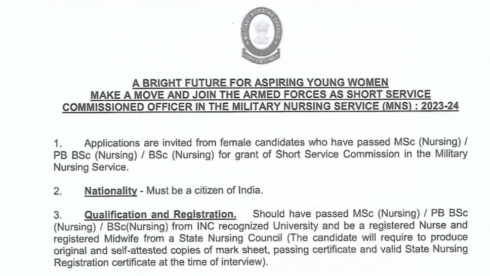 आवेदन के लिए जरूरी योग्यता मानदंड:- मिलिट्री नर्सिंग सर्विस सेलेक्शन के लिए कैंडिडेट्स को किसी मान्यता प्राप्त संस्थान से एमएससी नर्सिंग या पोस्ट बेसिक बीएससी नर्सिंग या बीएससी नर्सिंग डिग्री उत्तीर्ण होना चाहिए। साथ ही, उम्मीदवारों की आयु आवेदन की तिथि को 21 वर्ष से कम तथा 35 वर्ष से अधिक नहीं होनी चाहिए, यानी उम्मीदवार का जन्म 25 दिसंबर 1988 से पहले और 26 दिसंबर 2002 के बाद नहीं हुआ होना चाहिए। आरक्षित वर्गों के उम्मीदवारों के लिए अधिकतम आयु सीमा में छूट का प्रावधान नहीं है।