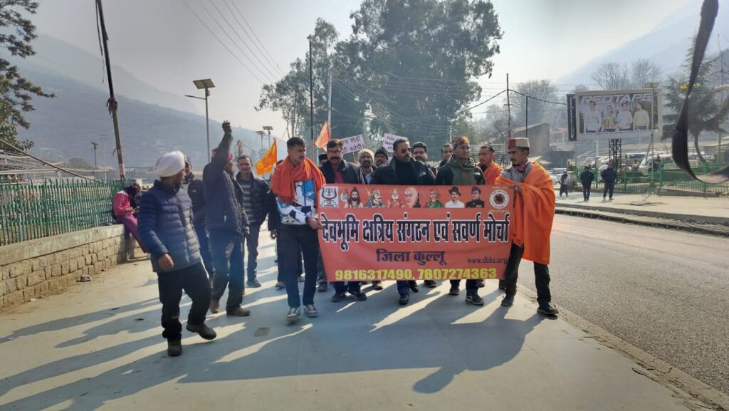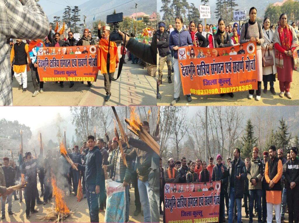 कुल्लू अपडेट ,देवभूमि क्षत्रिय संगठन एवं सवर्ण मोर्चा ने आज ढालपुर में जिला प्रशासन के खिलाफ विरोध प्रदर्शन किया। उन्होने निर्मला देवी को झूठे केस में फंसाने और उनकी बेटी के साथ मारपीट करने के मामले में कड़ी से कड़ी कार्यवाही करने की मांग की। उन्होने एससी एसटी एक्ट के खिलाफ विरोध किया और निर्मला देवी को न्याय देने की गुहार लगाई। इस मौके पर देवभूमि क्षत्रिय संगठन एवं सवर्ण मोर्चा के प्रदेश अध्यक्ष रुमीत ठाकुर भी आये थे। उन्होने कहा की समय रहते अगर इनको न्याय नहीं मिला तो कुल्लू में कर्फ्यू लगाने की नौबत आ जाएगी और सभी प्रशासनिक अधिकारियों को अपने दफ्तर छोड़ कर भागना पड़ेगा। उन्होने यह भी कहा की अगर इन लोगों की F.I.R दर्ज नहीं की गयी तो कुल्लू का मैदान काम पड़ जाएगा इतनी संख्या में हम यहां एकत्रित होंगे। उन्होंने यह भी कहा की हम अपनी पर आये तो दफ्तरों पर ताले भी लगा देंगे। इस से पहले धर्मशाला में क्या हुआ है वो भी सबको याद होगा। इसके बाद सभी ने डीसी कुल्लू को एक ज्ञापन सौंपा जिसमें जल्द से जल्द कार्यवाही की मांग की है। गौर रहे की जमीनी विवाद के कारण निर्मला देवी को झूठे केस में फंसाया गया था। उन पर एक झूठा मामला दर्ज करवाया गया जिसमें उन पर जाति सूचक शब्द बोलने का इल्जाम लगाया है और विरोध करने पर बेटी के साथ भी मारपीट की थी। इस मौके पर देवभूमि क्षत्रिय संगठन एवं सवर्ण मोर्चा जिला कुल्लू के अध्यक्ष अमर ठाकुर , उपाध्यक्ष मुनीश,प्रदेश सोशल मीडिया प्रभारी अजय ठाकुर , लवली चौहान प्रदेश कोषाध्य्क्ष , जिला कुल्लू मुख्य कार्यकारिणी सदस्य शेर सिंह राणा , बबलू ठाकुर ,दिने राम ठाकुर , घनश्याम ठाकुर व् अन्य सदस्य उपस्थित रहे।