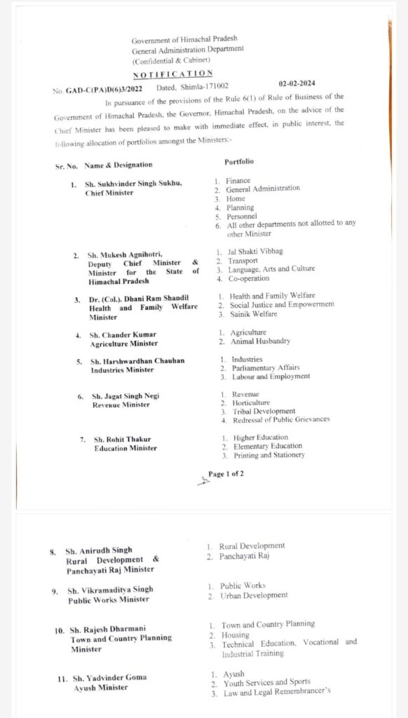 हिमाचल अपडेट , मुख्यमंत्री सुखविंद्र सिंह सुक्खू ने शुक्रवार को अपने सात कैबिनेट मंत्रियों को अतिरिक्त पोर्टफोलियो दिए हैं। इससे लोकसभा चुनाव से ठीक पहले सुक्खू ने एक तरह से सियासी संतुलन भी साध लिया है। सुक्खू ने जगत सिंह नेगी, राजेश धर्माणी और यादविंद्र गोमा को हैवीवेट मंत्री बनाया है, वहीं उन्होंने हर्षवर्द्धन और विक्रमादित्य सिंह को भी बडे़ विभाग दिए हैं। हालांकि, शिक्षा मंत्री रोहित ठाकुर को मुद्रण एवं लेखन सामग्री विभाग ही दिया गया है। इसकी वजह उनके पास बडे़ विभाग शिक्षा का होना है। हर तरह के डैमेज कंट्रोल के लिए बड़ा दिल दिखाते हुए मुख्यमंत्री सुखविंद्र सिंह सुक्खू ने मंत्रियों को खुश और संतुष्ट करने के अपने ही विभागों को कम कर उनमें बांट दिए हैं। मंत्री हर्षवर्द्धन चौहान के पास अब उद्योग, संसदीय कार्य और श्रम एवं रोजगार विभाग होंगे। उन्हें श्रम एवं रोजगार नया विभाग दिया गया है। यह मुख्यमंत्री के पास था। नए बने मंत्री यादविंद्र गोमा को आयुष विभाग हर्षवर्द्धन चौहान से वापस लेकर मिला था।