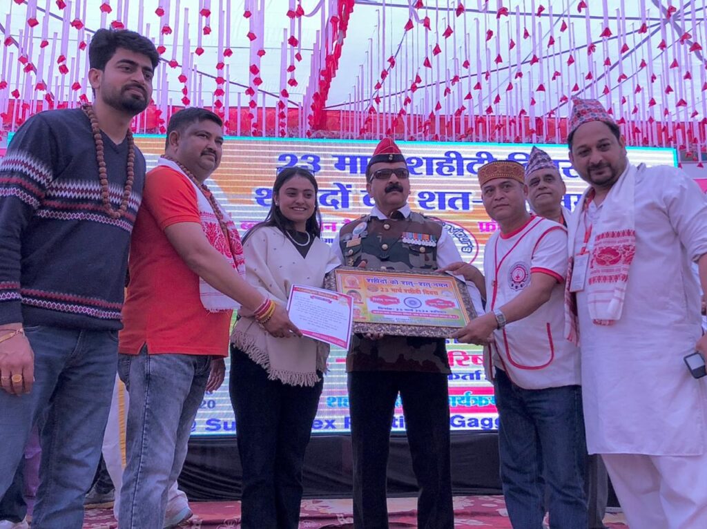 कुल्लू अपडेट ,23मार्च शहीद दिवस के उपलक्ष्य में पण्डित ख़ुशबू को काँगड़ा में सम्मानित सम्मानित किया गया आयोजित कार्यक्रम में कारगिल वार के हीरो नायक दीप चंद जी समेत अनेक गणमान्य व्यक्ति मौजूद थे जिसमें पूरे भारत से गणमान्य व्यक्ति काँगड़ा पहुँचे थे ,कार्यक्रम का आयोजन हिमालयन सेवियर्स द्वारा किया गया थावही दूसरी तरफ़ स्वर कोकिल की मधुर ध्वनि में शहीदी गीत सुनकर कारगिल योद्धा समेत सभी की आँखे नम हो गयी!पण्डित ख़ुशबू की तारीफ़ करते हुए उनका कहना था की हमें गर्व है ऐसी बेटी पर होनहार वीरवन के होत चिकने पत यह बात ख़ुशबू के ऊपर स्टिक बैठती है छोटी आयु से ही ख़ुशबू को संगीत का शौक़ था ,कही भी कोई भी कार्यक्रम होता तो ख़ुशबू की भागीदारी सबसे पहले रहती ,ख़ुशबू गर्व से कहती है कि जो अपने पारम्परिक संगीत में लय रस और संस्कार है उसका कोई मुक़ाबला नही,ख़ुशबू कहती है की हमें अपनी संस्कृति से प्यार करना चाहिए इसे सर्वो परी बनाए रखने के लिए हर संभव प्रयास करने चाहिए।ख़ुशबू ने देश ही नही अपितु बाहरी प्रदेशों में भी अपनी संस्कृति को बिखेरा है ।ख़ुशबू संगीत में गोल्ड मेडल जीत कर व देश नही अपितु प्रदेश के कई दूर स्थानो में कुल्लू का नाम रोशन कर चुकी हैहाल ही में ख़ुशबू अंतर्रष्ट्रिय कार्निवल मनाली में निर्णायक मंडल की भूमिका निभा चुकी है ,ख़ुशबू बहुत से नामी पुरस्कारों से सम्मानित हो चुकी है जिसमें नेशनल अवार्ड ,cmअवार्ड जैसे बहुत से पुरस्कार प्राप्त है ख़ुशबू ncc में भी बतौर सिनिर अंडर आफ़िसर की भूमिका भी निभा चुकी है ।ख़ुशबू की माता का नाम रविंद्रा पिता खेम राज व बड़ा भाई साहिल है ख़ुशबू मध्यवर्गी परिवार से संबंध रखती है ख़ुशबू की माता रविन्द्रा भारद्वाज स्वयं संगीत प्रेमी है ,ख़ुशबू सदैव अपनी कामयाबी का श्रेय अपने माता पिता गुरूजनो व मित्रों को देती है
