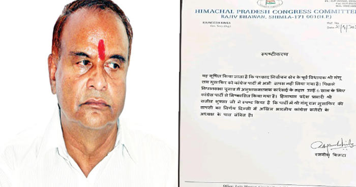 मुसाफिर ने मुख्यमंत्री सुखविंद्र सिंह सुक्खू की मौजूदगी में हुई शिमला संसदीय सीट के पदाधिकारियों की बैठक में भी भाग लिया था। अब रविवार देर शाम को कांग्रेस के प्रदेश संगठन महामंत्री रजनीश किमटा की ओर से एक स्पष्टीकरण जारी कर बताया गया कि गंगूराम मुसाफिर को पार्टी में वापस नहीं लिया गया है। 2022 के विधानसभा चुनाव में अनुशासनात्मक कार्रवाई के तहत उन्हें छह साल के लिए कांग्रेस पार्टी से निष्कासित किया गया है।