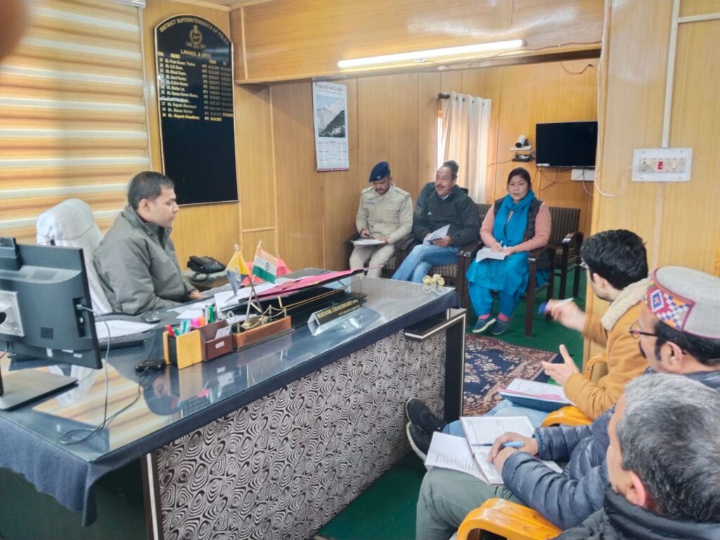 हिमाचल न्यूज ,जिला पुलिस अधीक्षक कार्यालय में मयंक चौधरी, IPS, जिला पुलिस अधीक्षक की अध्यक्षता में जिला के विभिन्न पदाधिकारियों के मध्य एक बैठक का आयोजन किया गया, जिसमें राजकुमार DySP (HQ) , खुशविंदर CDPO L&S, संजय डोगरा DPO (ICDS), हीरा नन्द DCPO L&S , जोगिन्द्र PO-IC, कुन्दन लाल Chairman CWC L&S, सुनीता Member CWC L&S, रविकांत Distt Labour Inspector, अर्जुन सिंह SI/SHO PS Keylong, मुकूल शर्मा SI/SHO PS Udaipur तथा चुन्ग राम SI/SHO PS Kaza शामिल रहे। बैठक के दौरान बाल श्रम, बाल अधिकार, बाल विवाह, श्रम कानून, श्रमिक अधिकार आदि विषयों पर चर्चा की गई। इस दौरान जिला में किसी भी प्रकार के बाल श्रम, बाल विवाह आदि के बारे में कोई भी सूचना मिलने पर सख्त कानूनी कार्यवाही किए जाने बारे निर्देशित किया गया तथा जिला में इस संदर्भ में जागरूकता अभियान चलाने बारे भी सहमति दर्ज की गई।