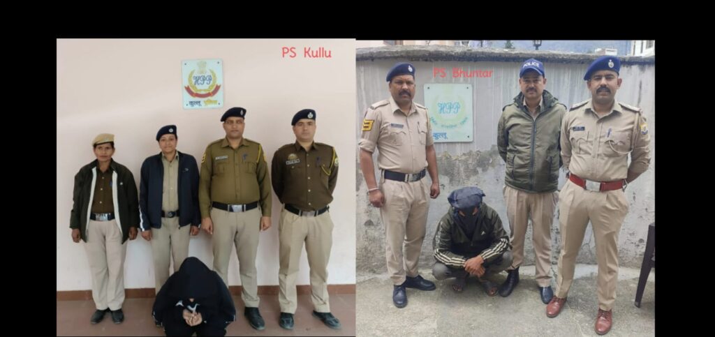 कुल्लू अपडेट , जिला कुल्लू पुलिस नशा माफियाओं के खिलाफ कड़ी से कड़ी कार्यवाही कर रही है पुलिस द्वारा नाकाबंदी करके और गश्त करके नशा तस्करों के खिलाफ तेज गति से अभियान चला रही है। इसी अभियान के तहत पुलिस की टीम ने दो अलग अलग मामलों में एक पुरुष और एक महिला के कब्जे से चरस बरामद की है। पुलिस से मिली जानकारी के अनुसार पहला मामला पुलिस थाना भुंतर का है। पुलिस की टीम पारला भुंतर में गश्त पर थी। इस दौरान पुलिस ने एक व्यक्ति की तलाशी ली तो देवी चंद (30 वर्ष) पुत्र टेक राम निवासी गाँव तान्दला डाकघर काइस के कब्ज़ा से 300 ग्राम चरस/ कैनबिस बरामद की है। दूसरे मामले में पुलिस थाना कुल्लू की टीम ने गश्त के दौरान चील मोड़ में एक महिला (28 वर्ष) निवासी कुर्ला ईस्ट मुम्बई महाराष्ट्रा के कब्ज़ा से 308 ग्राम चरस/ कैनबिस बरामद की है। दोनों आरोपियों पुलिस थाना भुंतर और पुलिस थाना कुल्लू में मादक पदार्थ अधिनियम के तहत मामला करके गिरफ्तार किया। आरोपियों को अदालत में पेश करके पुलिस हिरासत रिमांड हासिल किया जाएगा। आगे की कार्यवाही जारी है।