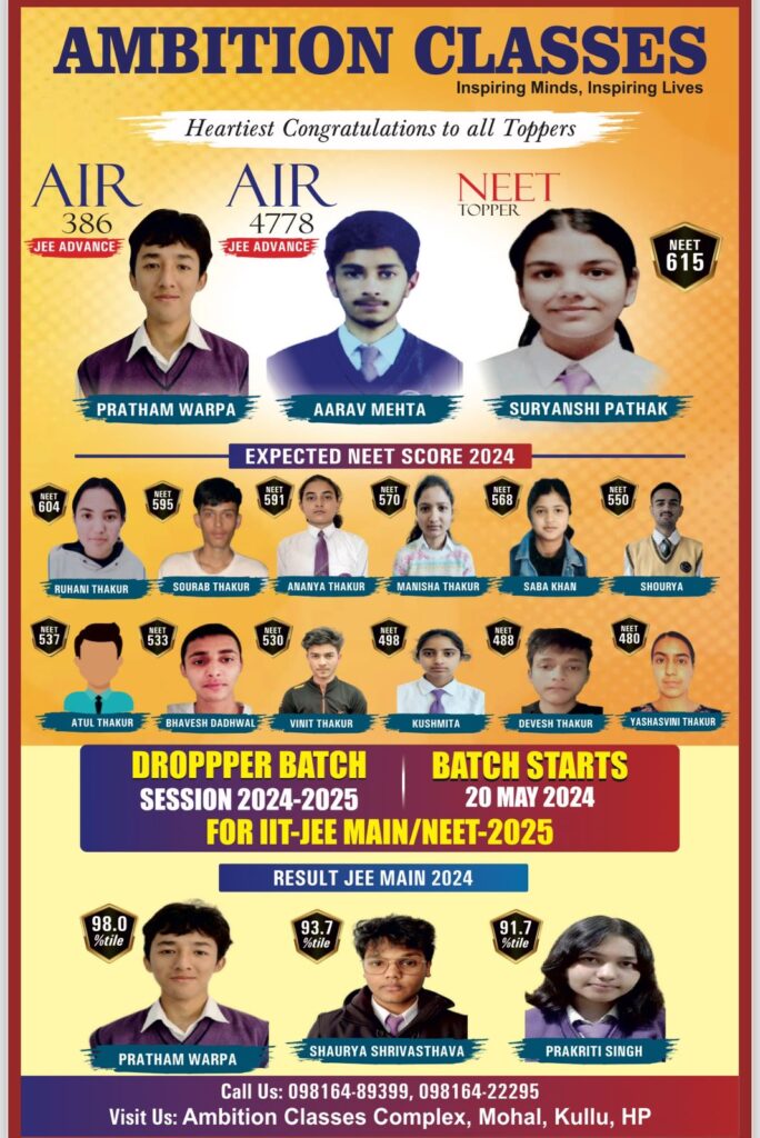 कुल्लू अपडेट,अगर मेहनत और लगन सच्ची हो तो इंसान कुछ भी हासिल कर सकता है। कुछ इसी तरह मेहनत करके और सच्ची लगन से चौपाल के रहने वाले आरव मेहता ने भी जेई एडवांस में 4778वा रैंक हासिल किया है। जेईई एडवांस 2024 परीक्षा का आयोजन 26 मई को किया गया था जिसके बाद भारतीय प्रौद्योगिकी संस्थान (आईआईटी) मद्रास की ओर से 9 जून को 10 बजे परीक्षार्थियों का रिजल्ट जारी कर दिया गया था और जिसमे एम्बिशन क्लासेज मौहल के छात्र आरव मेहता ने 4778वा स्थान हासिल किया है। आरव के पिता का नाम भूपिंदर मेहता है। वे अपना व्यवसाय करते है। आरव की माता का नाम सरोज बाला है और वे गृहिणी है। आरव की सफलता से पूरे परिवार में ख़ुशी का माहौल है।आरव ने अपनी इस उपलब्धि का श्रेय अपने माता पिता और अध्यापकों को दिया है।