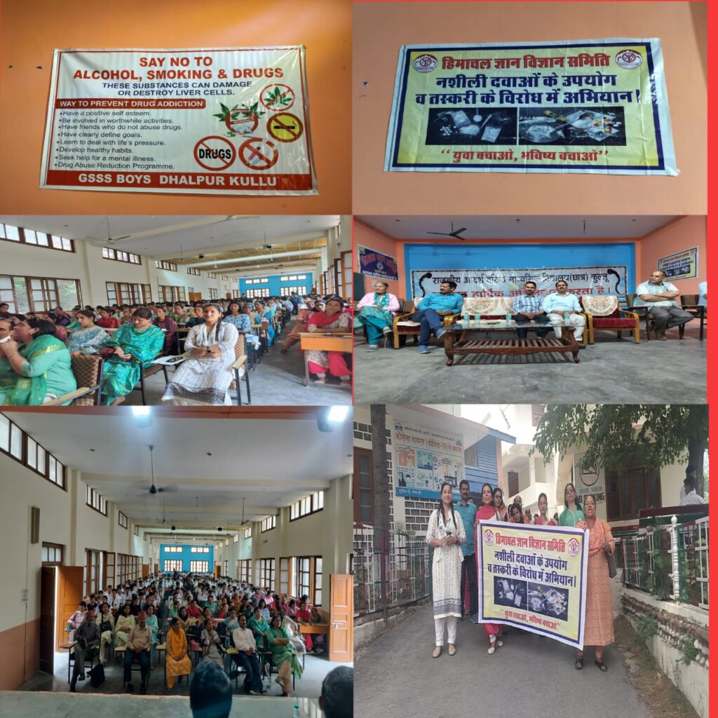 कुल्लू अपडेट ,अतरराष्ट्रीय नशा निवारण दिवस पर शहीद बालकृष्ण छात्र वरिष्ठ माध्यमिक स्कूल ढालपुर में बुधवार को स्वास्थ्य विभाग की ओर से एक कार्यक्रम का आयोजन किया गया। इसमें ज्ञान विज्ञान समिति ने भी अपना योगदान दिया। कार्यक्रम में नशे के खिलाफ स्कूल के विद्यार्थियों को जागरूक किया गया। कुल्लू अस्पताल के डॉक्टर आकाश ने कहा कि 19 से 23 साल की आयु तक के युवा नशे को शौकिया तौर पर शुरू करते हैं, लेकिन बाद में वे इसके आदी हो जाते हैं। उन्होंने कहा कि युवा पीढ़ी को नशे से बचने के लिए सबको मिलकर प्रयास करने होंगे।हिमाचल ज्ञान विज्ञान समिति के अध्यक्ष डॉ आरके शर्मा ने कहा कि वर्ल्ड एंटी ड्रग डे नशीली वस्तुओं के सेवन और तस्करी के खिलाफ जागरूकता कार्यक्रम का आयोजन किया गया उन्होंने कहा कि हिमाचल ज्ञान विज्ञान समिति के द्वारा आज के दिन पूरे प्रदेश भर में नशा मुक्त समाज को लेकर अभियान चलाया जा रहा है उन्होंने कहा कि कुल्लू जिला में भी बॉयज सीनियर सेकेंडरी स्कूल में टीचर होम कमेटी और स्कूल के छात्रों के साथ मिलकर शहर में जागरूकता रैली निकाली उन्होंने कहा कि कुल्लू जिला में जिस प्रकार नशे का प्रचलन बढ़ रहा है उसको रोकने के लिए हिमाचल ज्ञान विज्ञान समिति के द्वारा समय पर जागरूकता कार्यक्रम का आयोजन किया जाता है उन्होंने कहा कि आज हिमाचल ज्ञान विज्ञान समिति के द्वारा कुल्लू में भी जागरूकता कार्यक्रम का आयोजन किया उन्होंने कहा कि कुल्लू में छोटी उम्र के लड़के लड़कियों में नशे की आदतें बढ़ रही है उन्होंने कहा कि नशा मुक्त समाज बनाने के लिए सभी लोगों को अपना योगदान देना चाहिए और छात्राओं को नशे से दूर रहने के लिए अन्य सांस्कृतिक खेलकूद गतिविधियों भाग लेकर जीवन में सफल बनने के लिए पढ़ाई की तरफ ध्यान देना चाहिए विद्यार्थियों द्वारा जागरूकता रैली भी निकाली गयी इस दौरान स्कूल के प्रधानाचार्य, अध्यापक व अन्य लोग मौजूद रहे।