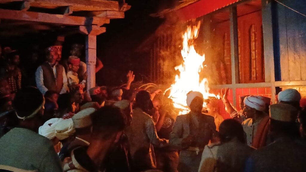 को पूरे लाव लश्कर के साथ माता के मंदिर देहरी में पहुंचाया। वहां देव पूजा अर्चना कर रात्रि 12 बजे के करीब यह देव कार्य शुरू हुआ। मंदिर के पास लगभग 70 फुट लंबी मशाल को देव आज्ञा अनुसार मंदिर में जलते दिए के साथ जलाया और देवता के करिदों ने इस मशाल को कंधे पर उठाकर मदिर के चारों ओर परिक्रमा कर लगभग 1 किलोमीटर दूर कन्नौन गांव पहुंचाया। गांव के बीच मिसाल को खड़ा कर देब खेल का निर्वाह हुआ और जलती मशाल के साथ देवी भगवती के गुर व उनके अंग संग चलने वाले शूरवीर देवता तूदला, बनशीरा खोडू, पंचवीर व देवता जहल के गुर ने जलती मशाल के आगे देवखेल कर देव परंपरा का निर्वाह किया। इसके पश्चात देव कार्य संपन्न होने के पश्चात इस जलती मशाल को गांव के बीच खड़ा किया और देव नाटी का आयोजन किया।,