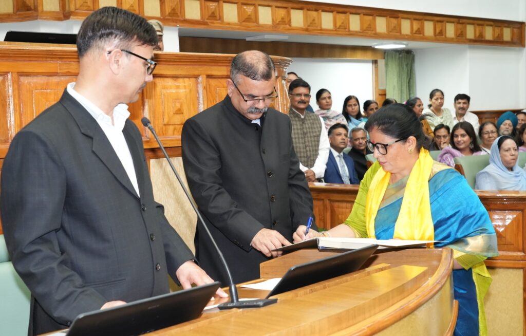 हिमाचल अपडेट,आज मुख्यमंत्री सुखविंद्र सिंह सुक्खू की धर्मपत्नी कमलेश ठाकुर सहित तीन नवनिर्वाचित विधायकों ने शपथ ले ली है. विधानसभा में नवनिर्वाचित विधायकों का शपथ ग्रहण समारोह हुआ. विधानसभा स्पीकर कुलदीप सिंह पठानिया ने विधानसभा के सदन सभागार में शपथ दिलाई। शपथ ग्रहण समारोह में मुख्यमंत्री सुखविंद्र सिंह सुक्खू, नेता प्रतिपक्ष जयराम ठाकुर, विधायक सहित कई गणमान्य लोग उपस्थित हुए।मुख्यमंत्री सुक्खू की पत्नी कमलेश ठाकुर देहरा से चुनाव जीती हैं. इसी तरह से नालागढ़ विधानसभ सीट से हरदीप सिंह चुनाव जीतकर पहली बार विधायक बने हैं. हमीरपुर विधानसभा सीट पर आशीष शर्मा भाजपा टिकट पर चुनाव जीतने के बाद दूसरी बार विधायक पद की शपथ ली. शपथ लेने के बाद हमीरपुर के विधायक आशीष शर्मा बोले जय शंकर महादेव।हिमाचल प्रदेश विधानसभा में अभी तक सदस्यों की संख्या 65 थी. सोमवार को तीन नवनिर्वाचित विधायकों द्वारा शपथ लेने के बाद सदस्यों की संख्या 68 गई. इनमें कांग्रेस के 40 और बीजेपी के 28 विधायक हैं. हिमाचल प्रदेश विधानसभा में बहुमत के लिए 35 का आंकड़ा चाहिए. वही देहरा की विधायक कमलेश ठाकुर ने शपथ लेने के बाद अपने आधिकारिक फेसबुक पेज पर पोस्ट करते हुए लिखा कि आज देहरा के सभी लोगों के अशीर्वाद से शिमला में विधायक के रुप में शपथ ली। मैं ईश्वर की शपथ लेती हूं कि विधि द्वारा स्थापित भारत के संविधान के प्रति सच्ची श्रद्धा व निष्ठा रखूंगी और देहरा विधानसभा क्षेत्र के प्रति अपने हर कर्तव्य का निर्वहन करूंगी।