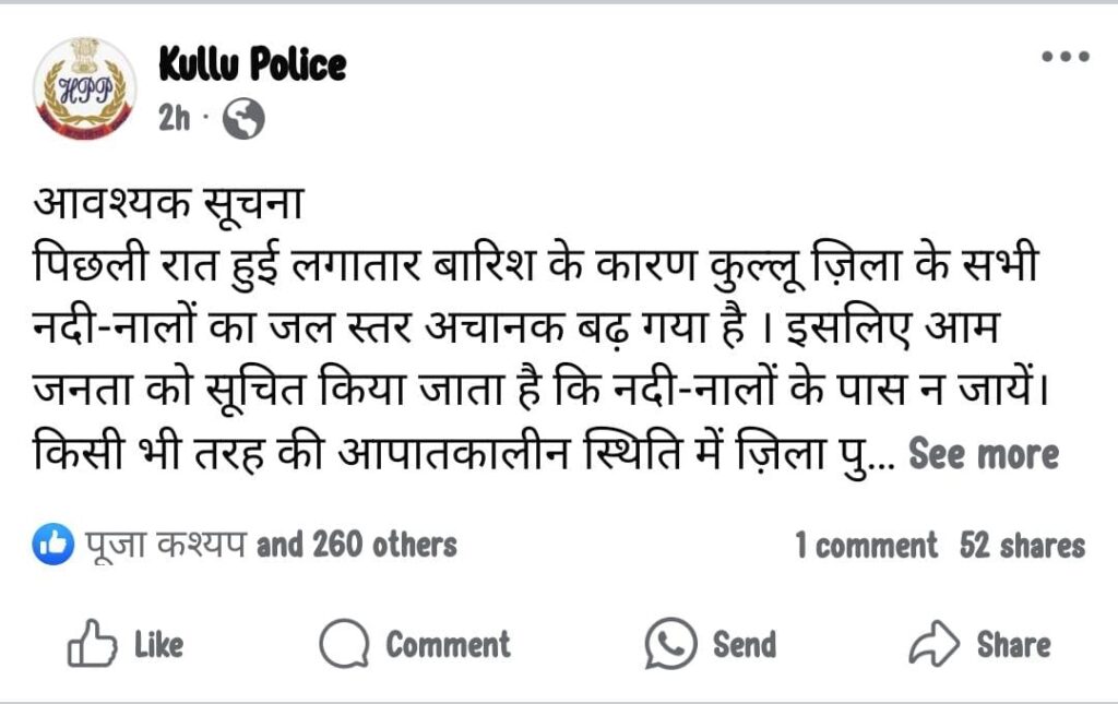 कुल्लू अपडेट , जिला कुल्लू में भारी बारिश होने के कारण नदी नालों ने अपना रौद्र रूप दिखाना शुरू कर दिया है। लगातार हुई बारिश के कारण कुल्लू जिला की ब्यास नदी और पार्वती नदी का जलस्तर बढ़ गया है। ऐसे में कुल्लू पुलिस द्वारा अपने फेसबुक पेज से माध्यम से लोगों से नदी नालों के निकट न जाने की अपील की है। उन्होने कहा है की पिछली रात हुई लगातार बारिश के कारण कुल्लू ज़िला के सभी नदी-नालों का जल स्तर अचानक बढ़ गया है । इसलिए आम जनता को सूचित किया जाता है कि नदी-नालों के पास न जायें। किसी भी तरह की आपातकालीन स्थिति में ज़िला पुलिस कंट्रोल रूम नम्बर 8219681600 पर सम्पर्क करें। कुल्लू पुलिस सदैव आपकी सेवा ने तत्पर
