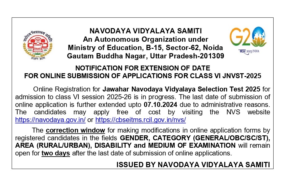 कुल्लू अपडेट,जवाहर नवोदय विद्यालय में कक्षा 6 में प्रवेश लेने हेतु प्रवेश परीक्षा के लिए आवेदन करने की तिथि को बढ़ाकर 7 अक्टूबर 2024 तक किया गया है प्राचार्य जवाहर नवोदय विद्यालय बंदरोल ने जानकारी दी कि इच्छुक विद्यार्थी अथवा उनके अभिभावक ऑनलाइन लिंक पर जाकर इस प्रवेश परीक्षा के लिए पंजीकरण करवा सकते हैं तथा नवोदय विद्यालय समिति की वेबसाइट पर जाकर https://navodaya.gov.in/ व https://cbseitms.rcil.gov.in/nvs/ लिंक के माध्यम से भी फार्म भर सकते हैं।