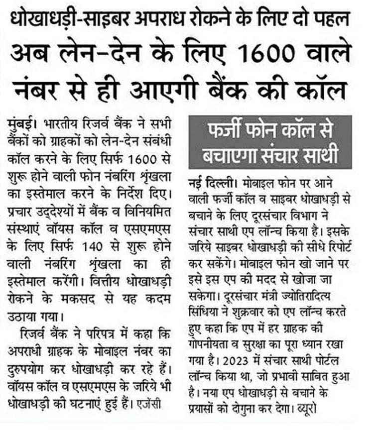 RBI यानी भारतीय रिजर्व बैंक ने ऑनलाइन फ्रॉड और साइबर अपराधों को रोकने के लिए नई गाइडलाइंस जारी की है, ताकि लोगों को फर्जी नंबरों से आने वाले कॉल की पहचान हो सके। रिजर्व बैंक ने मार्केटिंग और बैंकिंग वाले कॉल्स के लिए दो नई सीरीज की घोषणा की है। मोबाइल नंबर पर इन्हीं दो नंबरों से ही सही मार्केटिंग और बैंकिंग कॉल आएंगे। इन दोनों सीरीज के अलावा किसी और नंबर से आने वाले कॉल फर्जी होंगे।RBI ने अपनी गाइडलाइंस में कहा है कि बैंकों को ग्राहकों को लेन-देन संबंधी कॉल करने के लिए 1600 से शुरू होने वाली सीरीज का ही इस्तेमाल करना होगा। बैंक इस सीरीज के अलावा किसी अन्य नंबर सीरीज का इस्तेमाल ग्राहकों को कॉल करने के लिए नहीं कर सकते हैंइसके अलावा बैंक द्वारा होम लोन, पर्सनल लोन, कार लोन, क्रेडिट कार्ड, इंश्योरेंस, टर्म डिपॉजिट जैसी सेवाओं के लिए प्रमोशन कॉल किए जाते हैं। बैंक केवल 140 से शुरू होने वाली सीरीज से ही ग्राहकों को इन सेवाओं के लिए प्रमोशनल कॉल कर सकते हैं। इसके लिए बैंक और सेवाओं को प्रमोट करने वाली कंपनियों को टेलीकॉम ऑपरेटर्स के साथ खुद को व्हाटलिस्ट में रजिस्टर करवाना होगा।दूरसंचार विभाग (DoT) ने अपनी आधिकारिक X हैंडल से भारतीय रिजर्व बैंक की गाइडलाइंस के बारे में यूजर्स को बताया है।यूजर्स केवल 1600 और 140 नंबरों से आने वाले कॉल्स से सही और फर्जी कॉल की पहचान कर सकते हैं।