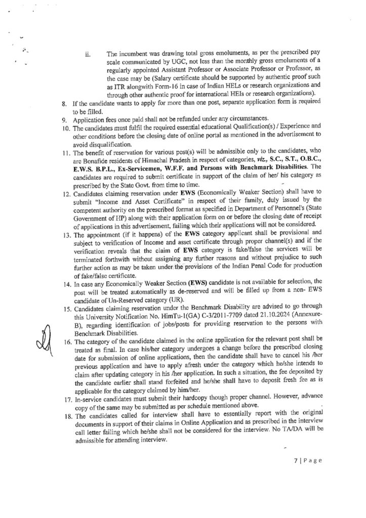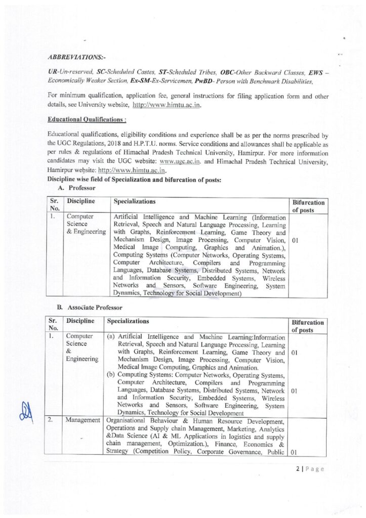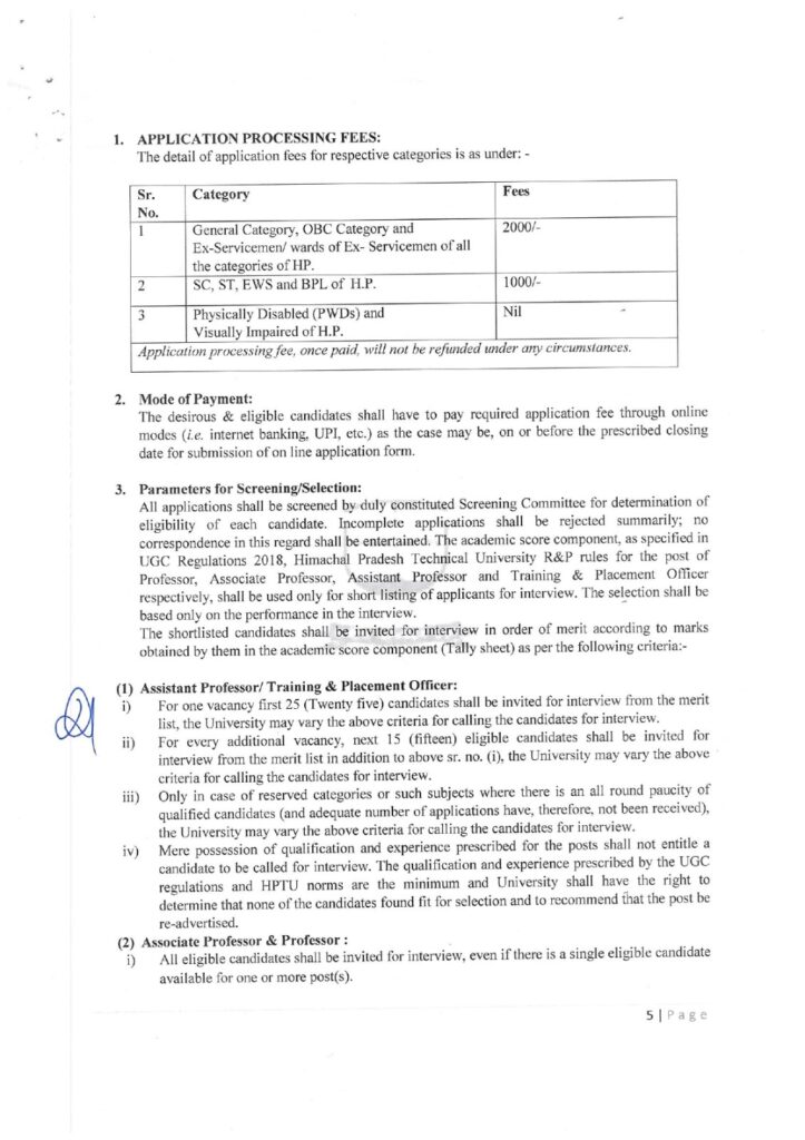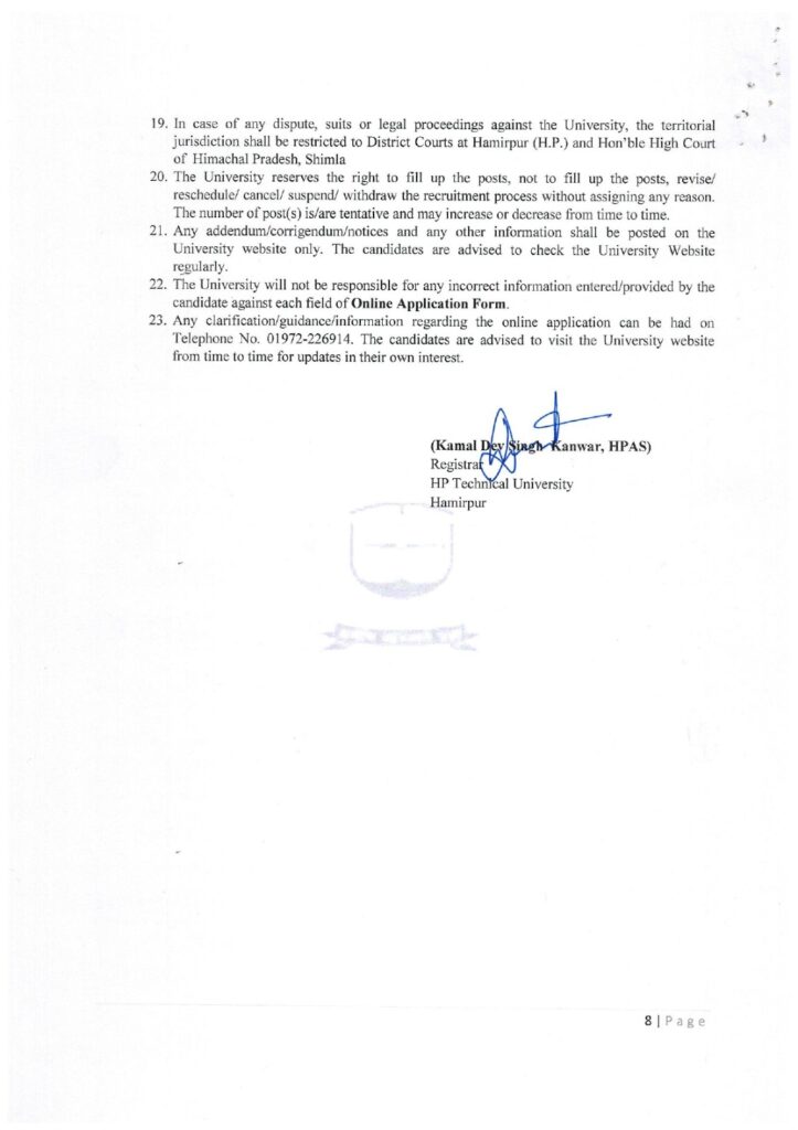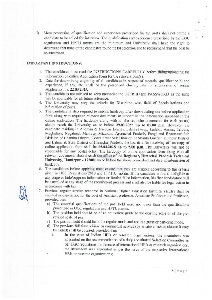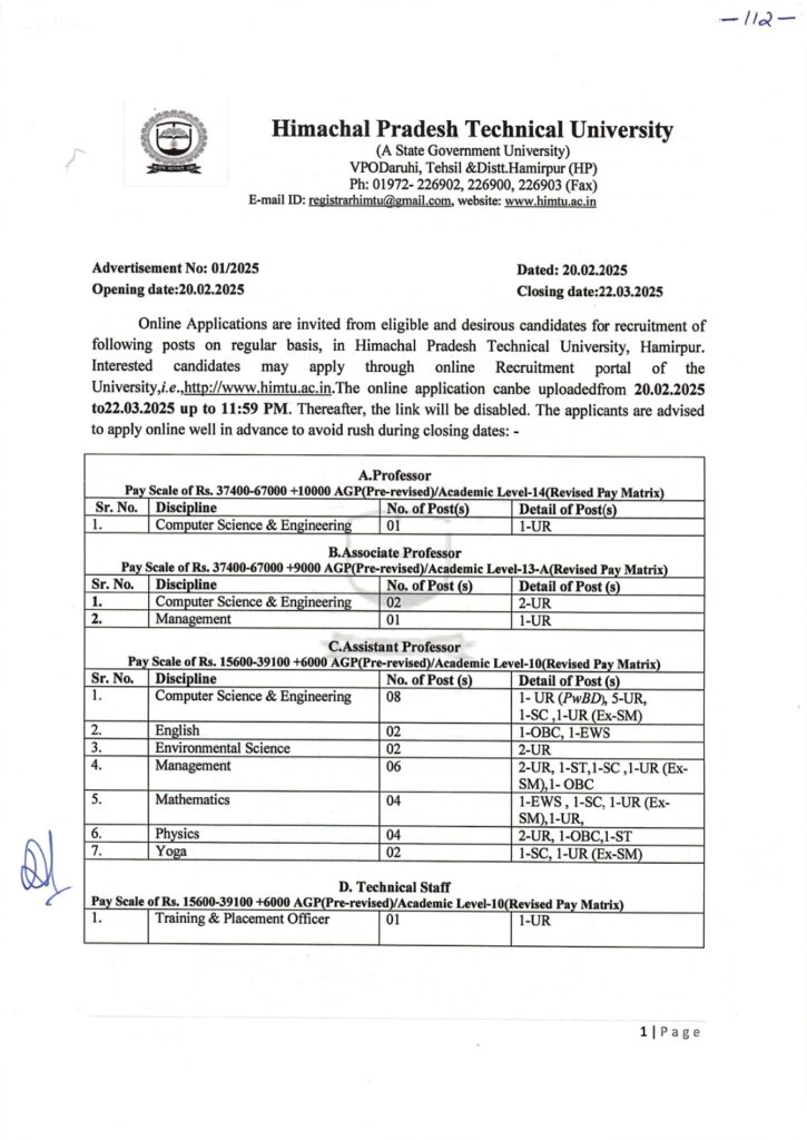 हिमाचल अपडेट,हिमाचल प्रदेश तकनीकी विश्वविद्यालय हमीरपुर ने पहली बार नियमित आधार पर शिक्षकों की भर्ती करने का निर्णय लिया है। तकनीकी विश्वविद्यालय में कुल 33 पदों के लिए ऑनलाइन आवेदन प्रक्रिया शुरू हो गई है, जिसमें शिक्षकों के 32 पद और एक ट्रेनिंग एवं प्लेसमैंट ऑफिसर का पद शामिल है। इच्छुक अभ्यर्थी 22 मार्च तक आवेदन कर सकते हैं। अब तक जहां विश्वविद्यालय में लगभग 35 शिक्षक गेस्ट फैकल्टी के रूप में कार्यरत थे, वहीं इस बार 33 स्थायी पदों पर योग्य शिक्षकों का चयन किया जाएगा। इससे न केवल शिक्षण गुणवत्ता में सुधार होगा, बल्कि छात्रों को भी एक बेहतर शैक्षिक अनुभव मिलेगा।ये भरे जाएंगे पदतकनीकी विश्वविद्यालय में प्राध्यापक का 1, सह प्राध्यापक के 3 (कम्प्यूटर साइंस एंड इंजीनियरिंग के 2, प्रबंधन का 1), सहायक प्राध्यापक के 28 और ट्रेनिंग एवं प्लेसमैंट ऑफिसर का 1 पद भरा जाएगा।विषयवार पदों का ब्याैरा तकनीकी विश्वविद्यालय में विषयवार पदों की बात करें तो कम्प्यूटर साइंस एंड इंजीनियरिंग के 11 पद (8 सहायक प्राध्यापक, 2 सह प्राध्यापक, 1 प्राध्यापक), अंग्रेजी के 2 पद (सहायक प्राध्यापक), पर्यावरण विज्ञान के 2 पद (सहायक प्राध्यापक), प्रबंधन के 7 पद (6 सहायक प्राध्यापक, 1 सह प्राध्यापक), गणित के 4 पद (सहायक प्राध्यापक), भौतिकी के 4 पद (सहायक प्राध्यापक) और योग के 2 पद (सहायक प्राध्यापक) भरे जाएंगे। ये रहेगा आवेदन शुल्कतकनीकी विश्वविद्यालय के कुल सचिव कमल देव सिंह कंवर ने बताया कि इन पदों के लिए आवेदन करने वाले अभ्यर्थियों के लिए आवेदन शुल्क भी तय कर दिया गया है। इसके तहत सामान्य, ओबीसी, एक्स-सर्विसमैन सहित अन्य के लिए 2000 और एससी, एसटी, ईडब्ल्यूएस व बीपीएल अभ्यर्थियों को 1000 रुपए शुल्क देना होगा।