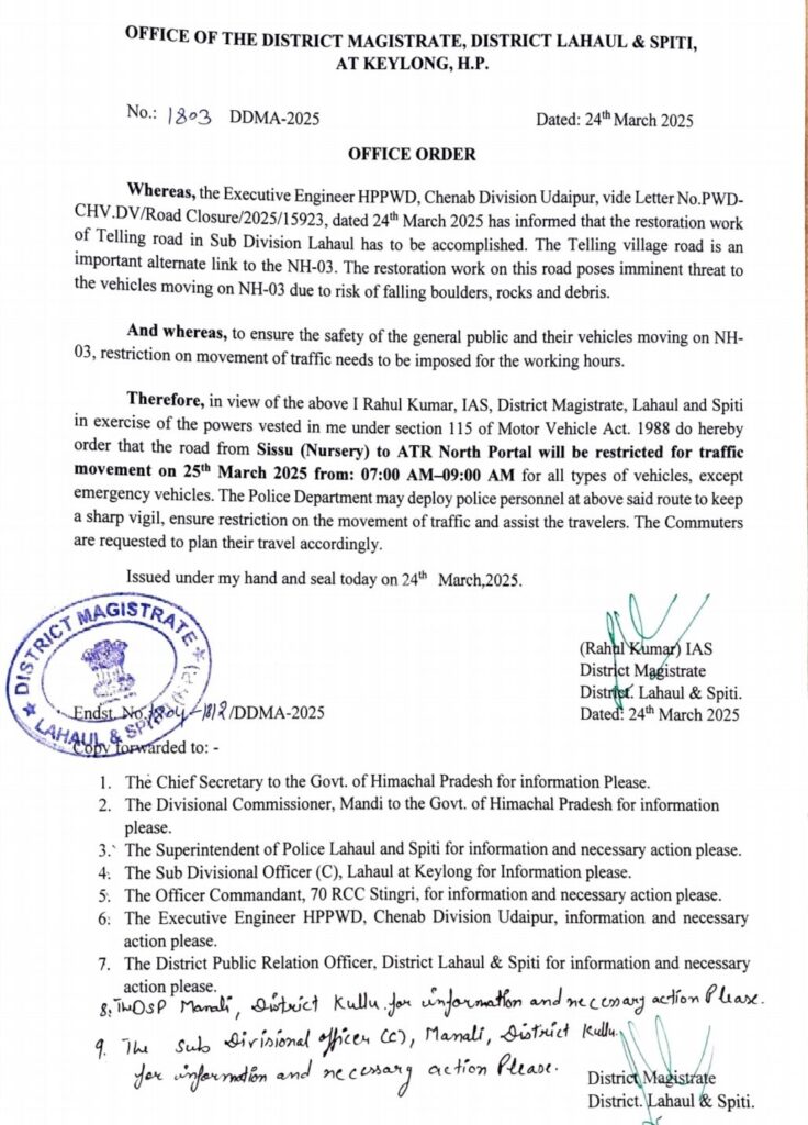 कुल्लू अपडेट,उपायुक्त लाहौल स्पीति राहुल कुमार ने आदेश जारी करते हुए कहा कि उपमंडल लाहौल में तेलिंग मार्ग का जीर्णोद्धार कार्य पूरा किया जाना है। इस सड़क पर जीर्णोद्धार कार्य के कारण एनएच-03 पर चलने वाले वाहनों के लिए पत्थर, चट्टानें और मलबा गिरने का खतरा रहता है। लिहाजा मोटर वाहन अधिनियम के तहत सिस्सू (नर्सरी) से एटीआर नॉर्थ पोर्टल तक की सड़क 25 मार्च 2025 को सुबह 07:00 बजे से सुबह 09:00 बजे तक आपातकालीन वाहनों को छोड़कर सभी प्रकार के वाहनों के लिए यातायात की आवाजाही के लिए प्रतिबंधित रहेगी।पुलिस विभाग उक्त मार्ग पर कड़ी निगरानी रखने, यातायात की आवाजाही पर प्रतिबंध सुनिश्चित करने और यात्रियों की सहायता के लिए पुलिस कर्मियों को तैनात किया जा सकता है।