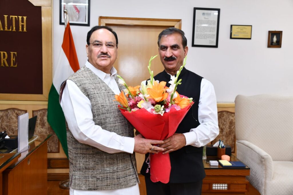 हिमाचल अपडेट,आज नई दिल्ली में मुख्यमंत्री ठाकुर सुखविंद्र सिंह सुक्खू ने केंद्रीय स्वास्थ्य एवं परिवार कल्याण मंत्री जगत प्रकाश नड्डा से भेंट कर हिमाचल प्रदेश की स्वास्थ्य व्यवस्था, आयुष्मान भारत, राष्ट्रीय स्वास्थ्य मिशन के क्रियान्वयन एवं प्रगति तथा स्वास्थ्य अधोसंरचना के निर्माण को लेकर विस्तृत चर्चा की।