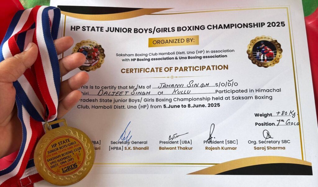 कुल्लू अपडेट ,निरमंड के शोहच की जाह्नवी ने बॉक्सिंग में फिर से जीता एक और गोल्ड मैडल जीता है। खुशी (जाह्नवी) की माता किरण बाला बेटी की सफलता से बेहद खुश हैं.राजकीय उत्कृष्ट वरिष्ठ माध्यमिक विद्यालय अर्सू ज़िला कुल्लू ने सक्षम बौक्सिंग क्लब हम्बोली(ज़िला ऊना) द्वारा HP Boxing Association & Una Boxing Association के सहयोग से 05 – 08 जून, 2025 तक आयोजित HP State Junior Boys/Girls Boxing Championship, 2025 में 80 कि. ग्रा. छात्रा वर्ग में प्रथम स्थान प्राप्तकर न केवल माता-पिता व विद्यालय के नाम को चार चांद लगाए हैं, अपितु समग्र क्षेत्रवासियों को भी गौरवान्वित किया है। शीघ्र ही वह अपने दमखम का प्रदर्शन राष्ट्रीय स्तर पर रोहतक, हरियाणा में करने जा रही है।
