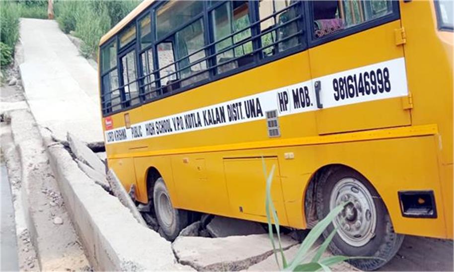 जिला ऊना के समूर गांव में गुरुवार काे उस समय बड़ा हादसा होते-होते टल गया, जब एक स्कूल बस अचानक सड़क धंसने से बीच रास्ते में ही फंस गई।