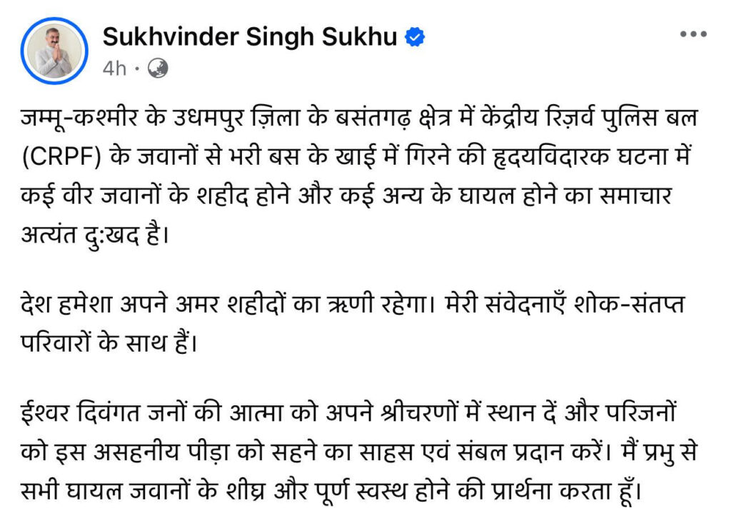 वही हिमाचल प्रदेश के मुख्यमंत्री सुखविंदर सिंह सुक्खू ने अपने आधिकारिक फेसबुक पेज पर लिखा जम्मू-कश्मीर के उधमपुर ज़िला के बसंतगढ़ क्षेत्र में केंद्रीय रिज़र्व पुलिस बल (CRPF) के जवानों से भरी बस के खाई में गिरने की हृदयविदारक घटना में कई वीर जवानों के शहीद होने और कई अन्य के घायल होने का समाचार अत्यंत दु:खद है।देश हमेशा अपने अमर शहीदों का ऋणी रहेगा। मेरी संवेदनाएँ शोक-संतप्त परिवारों के साथ हैं।