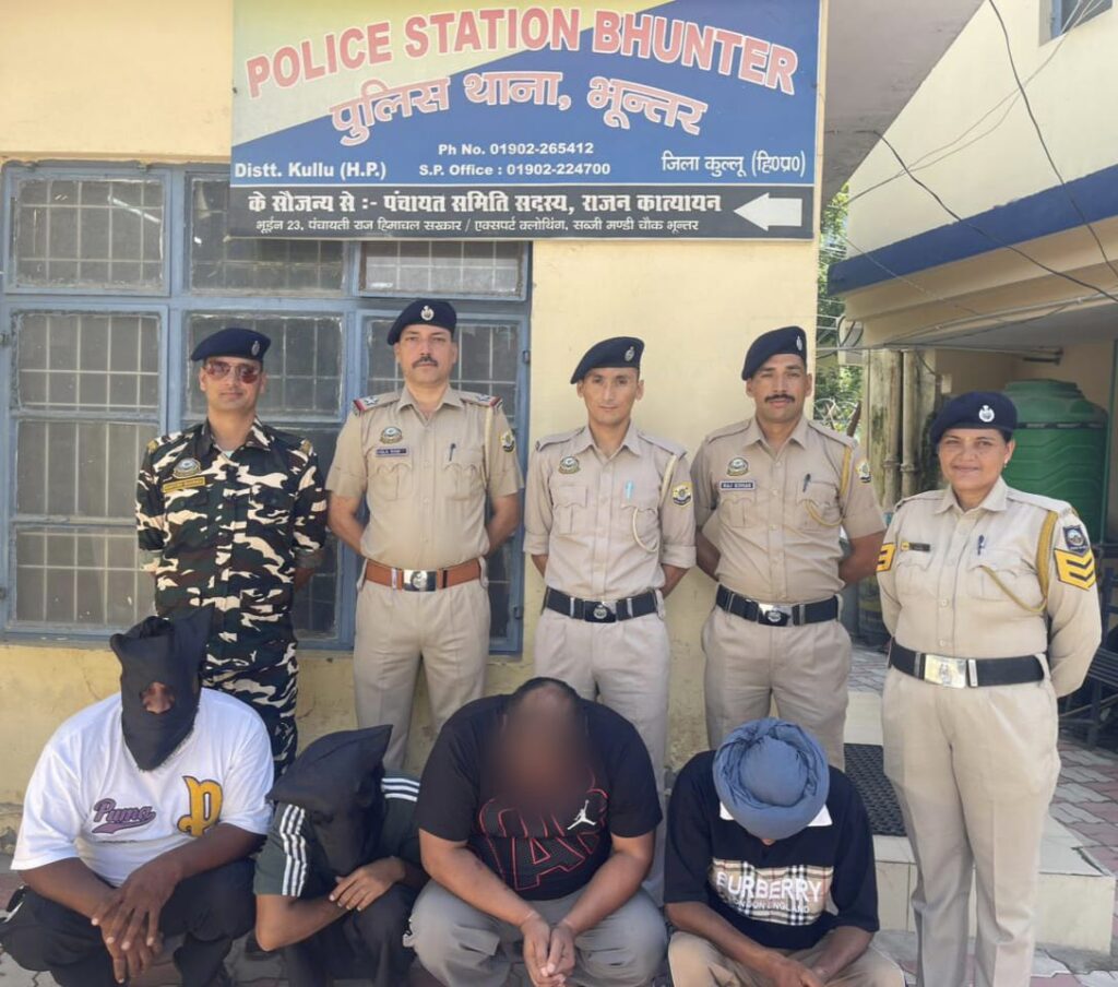जानकारी के अनुसार, दिनांक 12.08.2025 को पुलिस थाना भुंतर की टीम फोरलेन पर नाकाबंदी कर रही थी। इसी दौरान पंजाब नंबर की गाड़ी PB46AE2053 को शक के आधार पर रोका गया। जब पुलिस टीम ने गाड़ी की तलाशी ली, तो उसमें बैठे चार व्यक्तियों के कब्जे से 45 ग्राम चिट्टा (हेरोइन) बरामद किया गया।