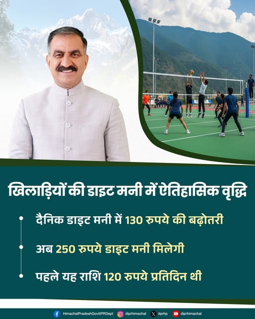 उन्होंने इस पहल को सिर्फ एक वित्तीय सहायता नहीं, बल्कि खिलाड़ियों की सेहत, मनोबल और प्रदर्शन को मजबूती देने वाला कदम बताया। सुक्खू ने कहा कि खेल केवल प्रतियोगिता नहीं है, यह अनुशासन, साहस और आत्मविश्वास का प्रतीक है।”